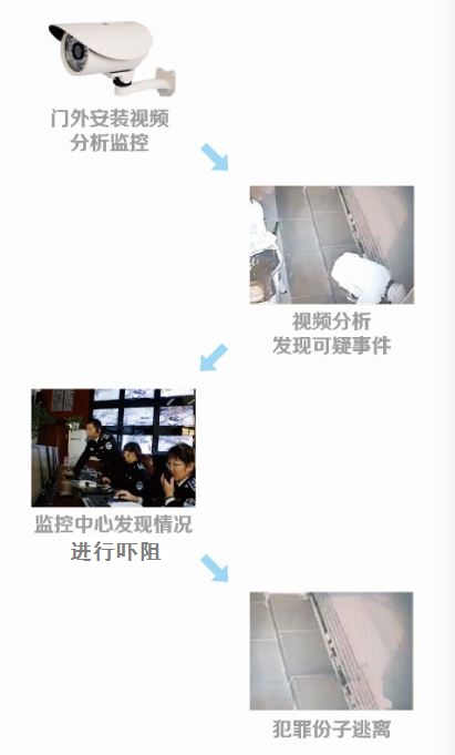 视频分析摄像机实时分析门外现场情况,出现可疑人员、行为,中心接警,并远程吓阻,制止犯罪。把偷盗拒之门外